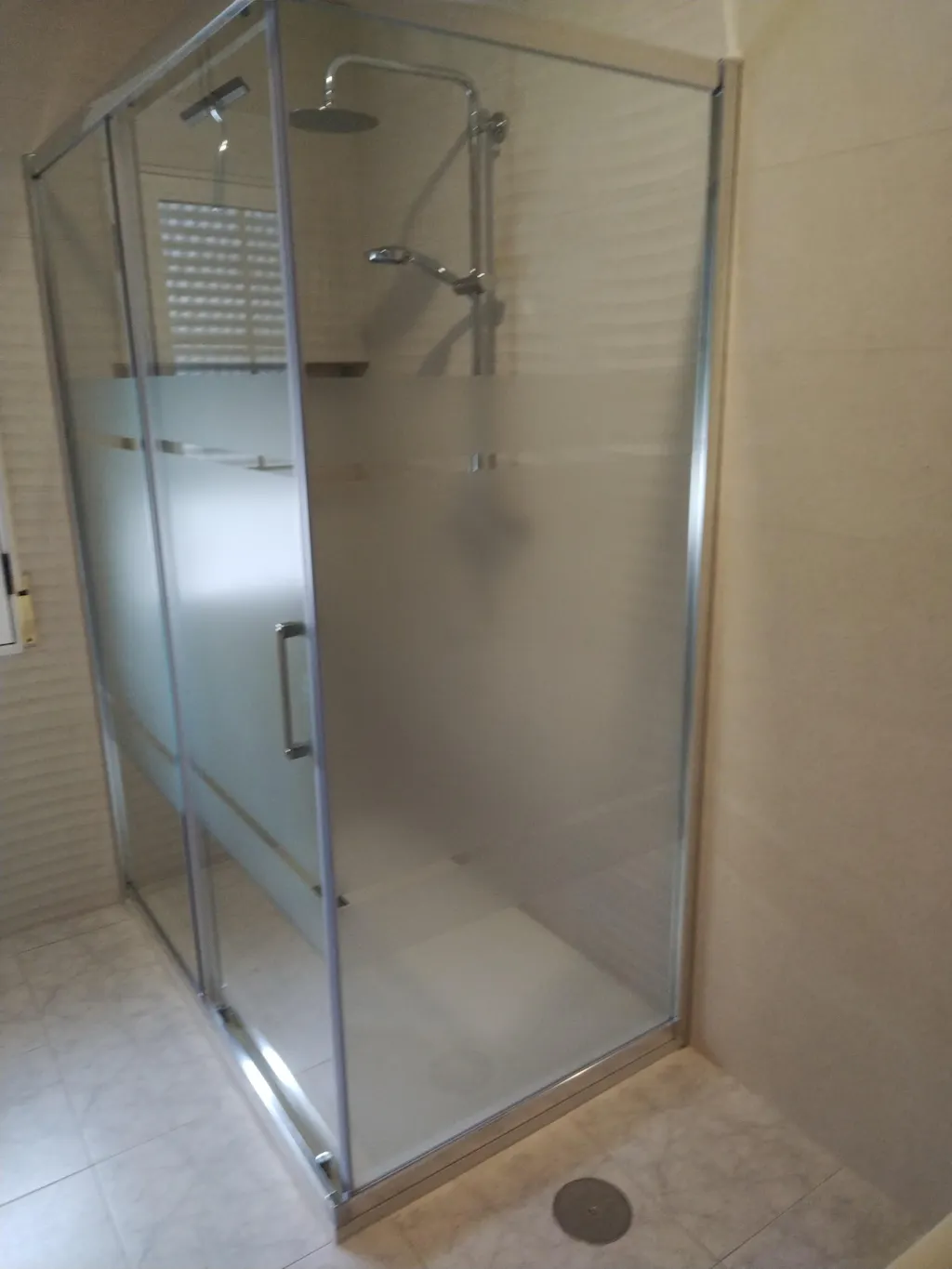 La mampara tiene gomas vierteaguas verticales para asegurar la estanqueidad entre la hoja corredera y el cristal fijo.